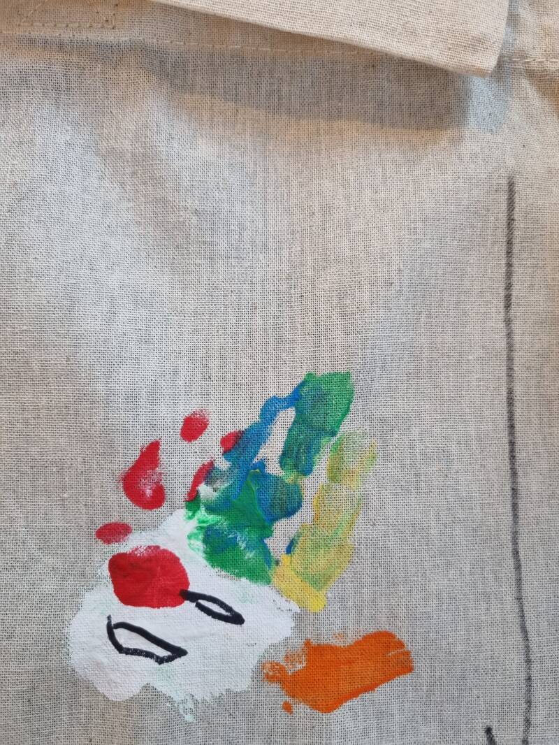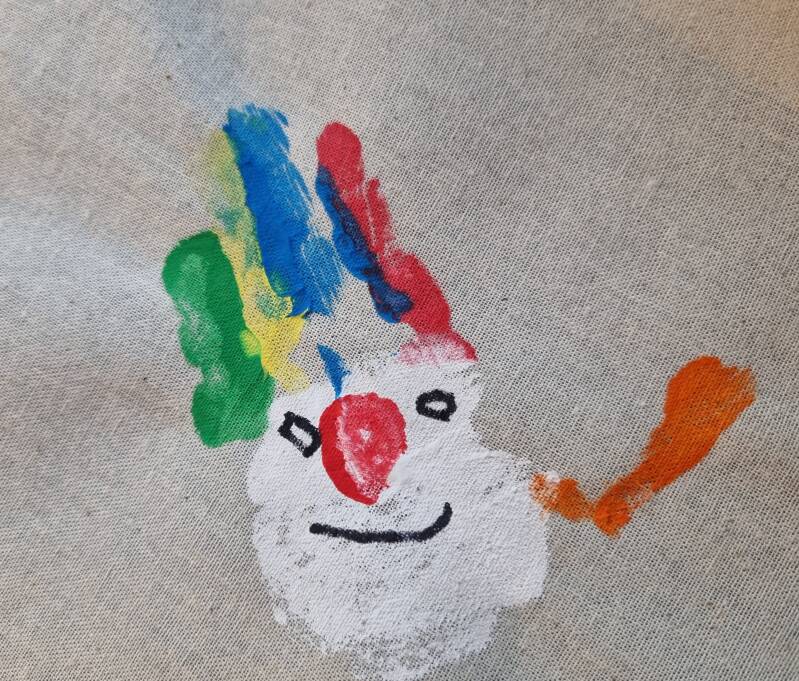 Die Handinnenfläche wird weiß angemalt. die Finger jeweils in bunten Farben. Dann wird die Hand auf die Tasche gedrückt. Alles gut trocknen lassen und ein Gesicht drauf malen. Fertig ist der Clown!