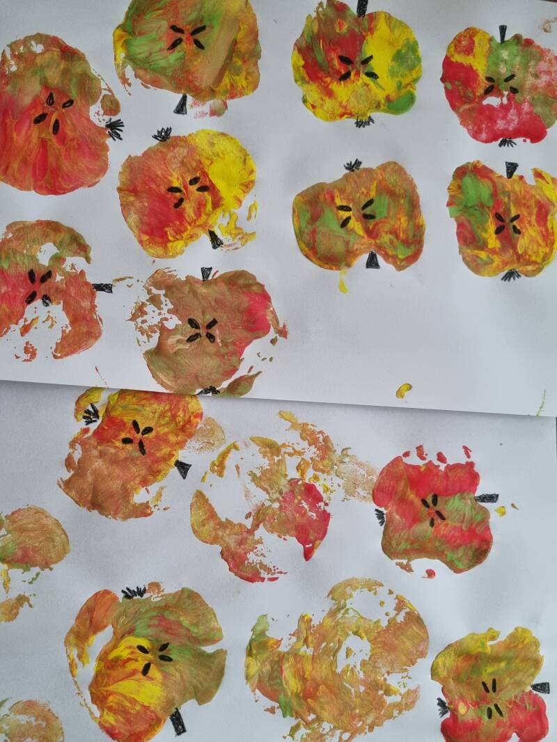 Diesen malst du nun mit Fingerfarben an und drückst die Apfelhälfte auf ein weißes Papier. Dies wiederholst du 12 mal. Lass die Äpfel trocknen, male kleine Kerne Stängel hinzu und schneide sie aus.