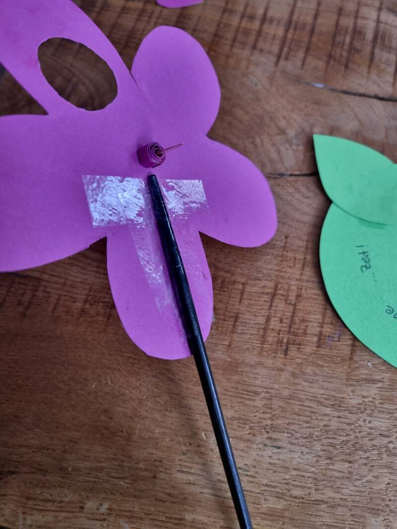 Am Ende kann man noch einen Stab befestigen und das Ganze in eine Blumenvase stecken.