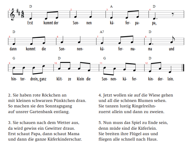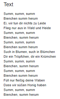 Summ, summ, summBienchen summ herumEi, wir tun dir nichts zu LeideFlieg nur aus in Wald und HeideSumm, summ, summBienchen, summ herumSumm, summ, summBienchen summ herumSuch in Blumen, such in BlümchenDir ein Tröpfchen, dir ein KrümchenSumm, summ, summBienchen, summ herumSumm, summ, summBienchen summ herumFüll nur fleißig deine WabenDass wir süßen Honig habenSumm, summ, summBienchen, summ herum