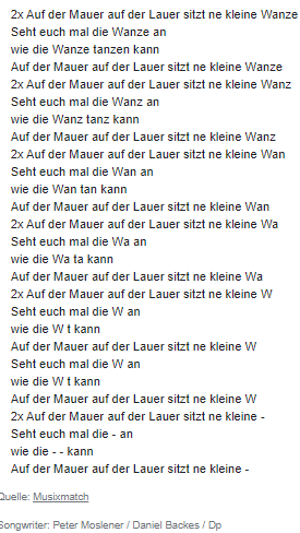 2x Auf der Mauer auf der Lauer sitzt ne kleine WanzeSeht euch mal die Wanze anwie die Wanze tanzen kannAuf der Mauer auf der Lauer sitzt ne kleine Wanze2x Auf der Mauer auf der Lauer sitzt ne kleine WanzSeht euch mal die Wanz anwie die Wanz tanz kannAuf der Mauer auf der Lauer sitzt ne kleine Wanz2x Auf der Mauer auf der Lauer sitzt ne kleine WanSeht euch mal die Wan anwie die Wan tan kannAuf der Mauer auf der Lauer sitzt ne kleine Wan2x Auf der Mauer auf der Lauer sitzt ne kleine WaSeht euch mal die Wa anwie die Wa ta kannAuf der Mauer auf der Lauer sitzt ne kleine Wa2x Auf der Mauer auf der Lauer sitzt ne kleine WSeht euch mal die W anwie die W t kannAuf der Mauer auf der Lauer sitzt ne kleine WSeht euch mal die W anwie die W t kannAuf der Mauer auf der Lauer sitzt ne kleine W2x Auf der Mauer auf der Lauer sitzt ne kleine -Seht euch mal die - anwie die - - kannAuf der Mauer auf der Lauer sitzt ne kleine -